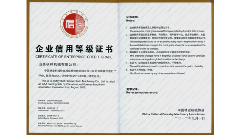 獲中國林業(yè)機(jī)械協(xié)會頒發(fā)的AAA級企業(yè)信用等級證書