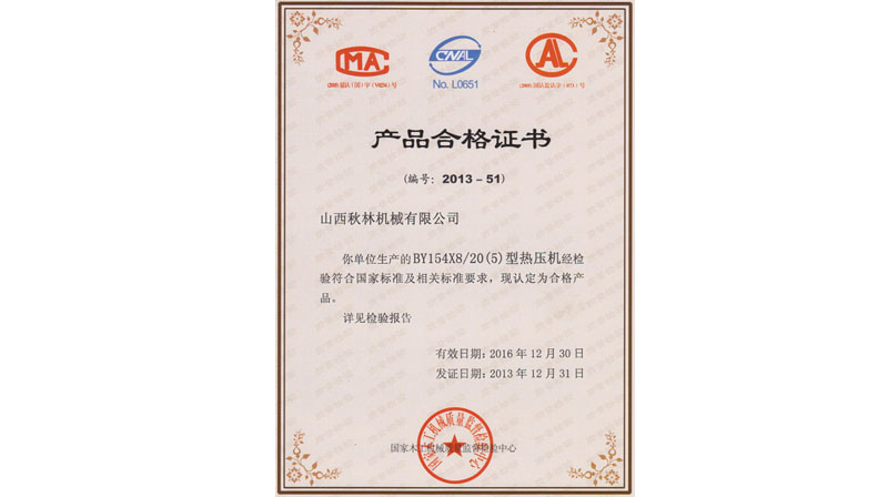 BY21型熱壓機(jī)、BY624×8/16、BY154×8/20(5)通過國家木工機(jī)械質(zhì)量監(jiān)督檢驗中心檢驗